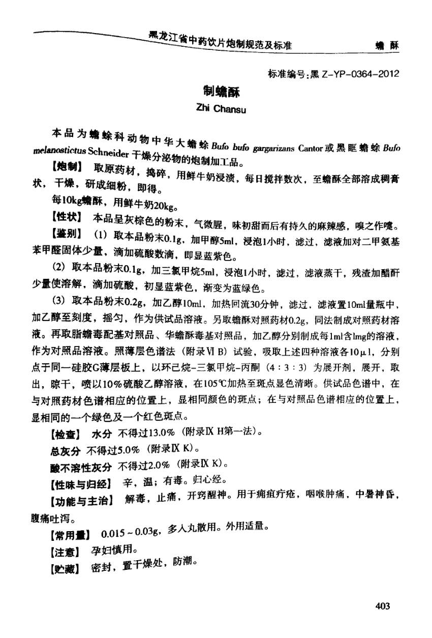 黑龙江省中药饮片炮制规范及标准 > 制蟾酥
