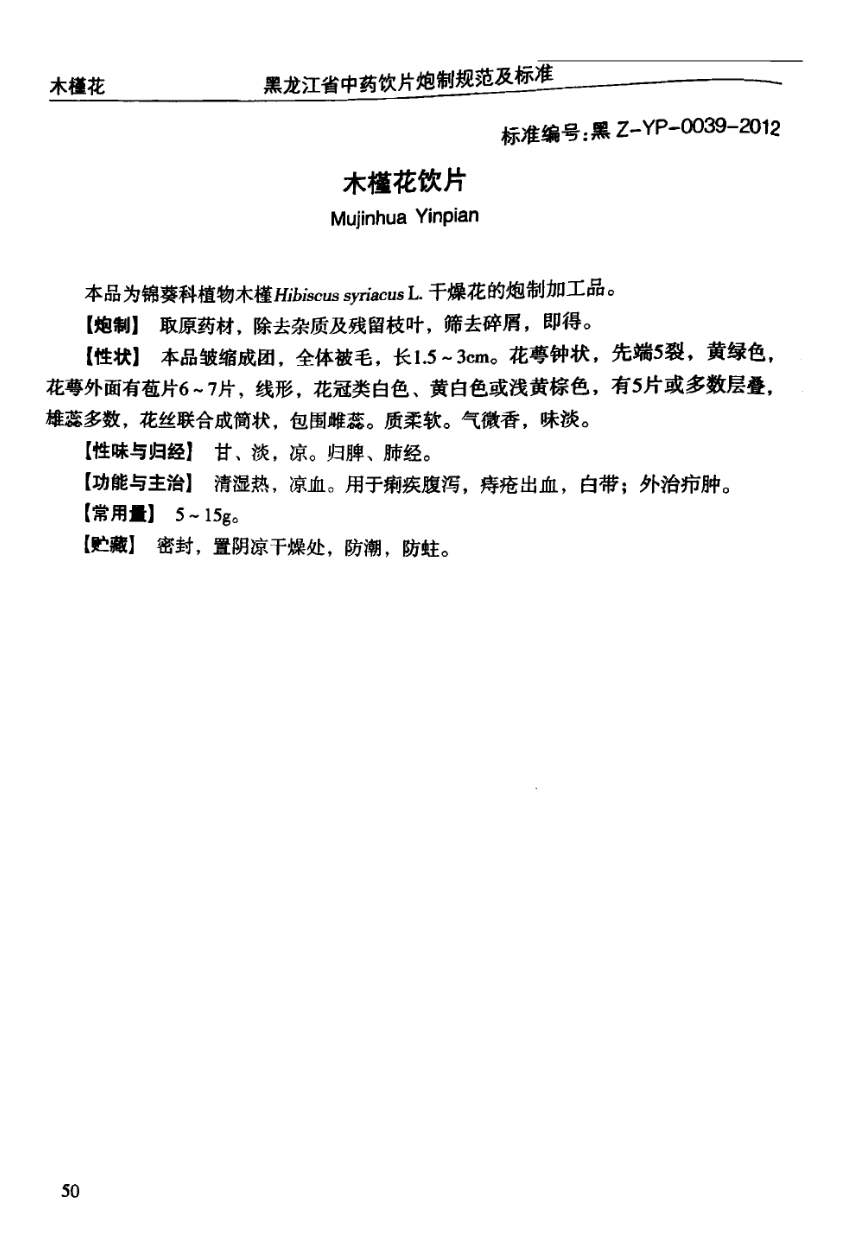 黑龙江省中药饮片炮制规范及标准 > 木槿花饮片