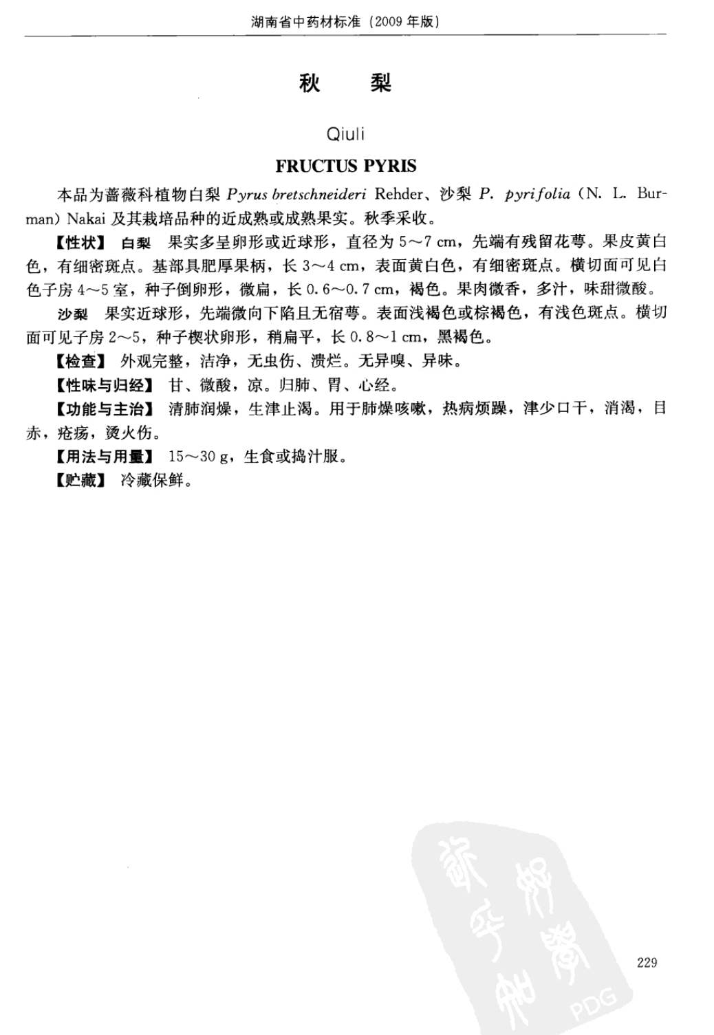 湖南省中药材质量标准 > 秋梨