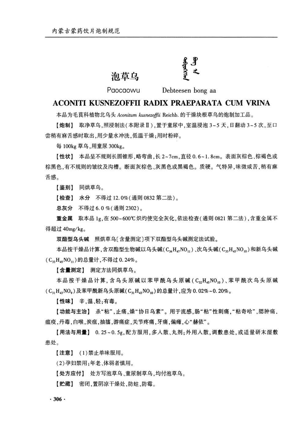 内蒙古蒙药饮片炮制规范(2020年版) > 泡草乌