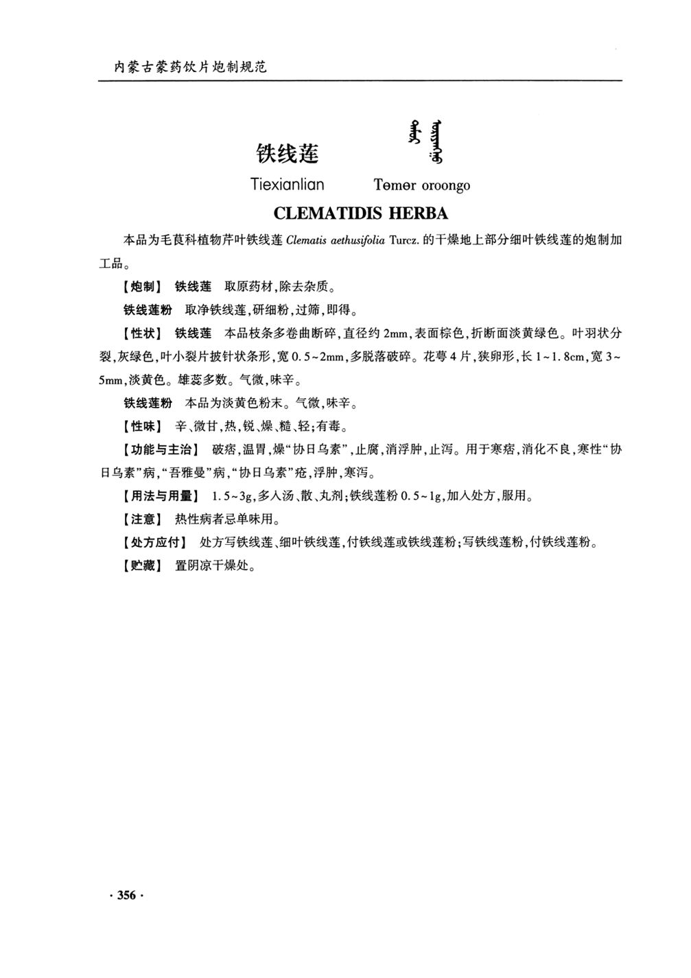 内蒙古蒙药饮片炮制规范(2020年版) > 铁线莲(铁线莲粉)
